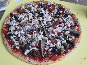 • On the side, slice pitted avocado and sundried tomatoes. Spread pizza sauce on the crust, add all the veggies. Sprinkle some Italian seasoning, garlic powder, a little bit of salt and about 2 teaspoons balsamic vingegar (this is the best part!). Top it off with feta cheese crumbles.