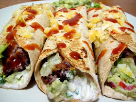 Burritos with low-fat whole wheat tortillas, home-made guacamole, cooked kidney beans seasoned with cumin powder, cayenne and paprika, salad mix (lettuce, carrots, red cabbage), yogurt & some shaves of colby-jack cheese. Topped with a little more cheese & lots of hot sauce. Don't get scared - this sauce is not super hot.