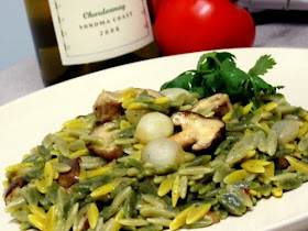 For a fan of mushrooms, I've surprised myself by not cooking any wild mushrooms before. Not that it was a mystery item from one of those 'Chopped' baskets, but I still felt a little bold buying Shiitake mushrooms. Having tasted White wine braised mushrooms with risotto in SFO, it was a no brainer what I was going to make with these babies. I had orzo at home, so out went the risotto and in went the orzo along with some pearl onions I had bought last week. The Spring Medley Orzo from Seattle's Pike's Place Market was flavored with lemon peel, lemon pepper, cilantro and other herbs sparing me from adding much seasoning. With all those citrusy flavors, this was refreshingly light for a pasta dish.