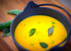 Are you one of those who love the combination of sweet and spicy? Like jam with jalapeno or chocolate with cayenne pepper? I am certainly a fan of these contrasting flavors in one dish; but if someone asked me to try Kadhi made with sweet, ripe mango pulp, I would've made a weird face. That's exactly what I did when I was introduced to this Gujarati specialty. I was visiting my friend Amishi's Grandma in India on one of our coinciding trips. Amishi and I have been very close friends through high school all the way to grad school. We've had a lot of culinary adventures together in our dorm kitchens. So I trust her when it comes to food. Nevertheless, when she told me that Aamras Kadhi (Mango puree Kadhi) was on the menu at her Grandma's place, I couldn't hide a big question mark on my face. This kadhi totally surprised me though (in a positive way) and expanded the list of everything I love sweet n spicy. I've held onto Aamras Kadhi recipe for a while. Now that Alphonso puree is available in the Indian grocery store, I decided to have a go at it.