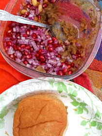 The 'cake' was nothing but layers of everything that goes in between the paav. You can find the elaborate recipe here. I mashed potatoes with ready-made dabeli masala, and mixed in green and tamarind chutnies with the potatoes. This was the bottom layer. On top went a layer of spice-roasted peanuts, pomegranate seeds, and finely chopped onion. Chopped cilantro would've been perfect, but I had run out of it. When we were ready to eat, I dug a big scoop of this filling, taking some from each layer, and smeared it on paav, then topped it off with crunchy sev. The idea and the outcome was loved by everyone.